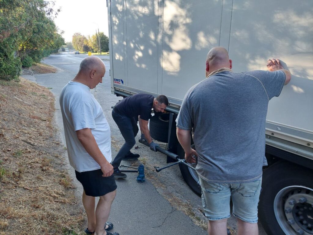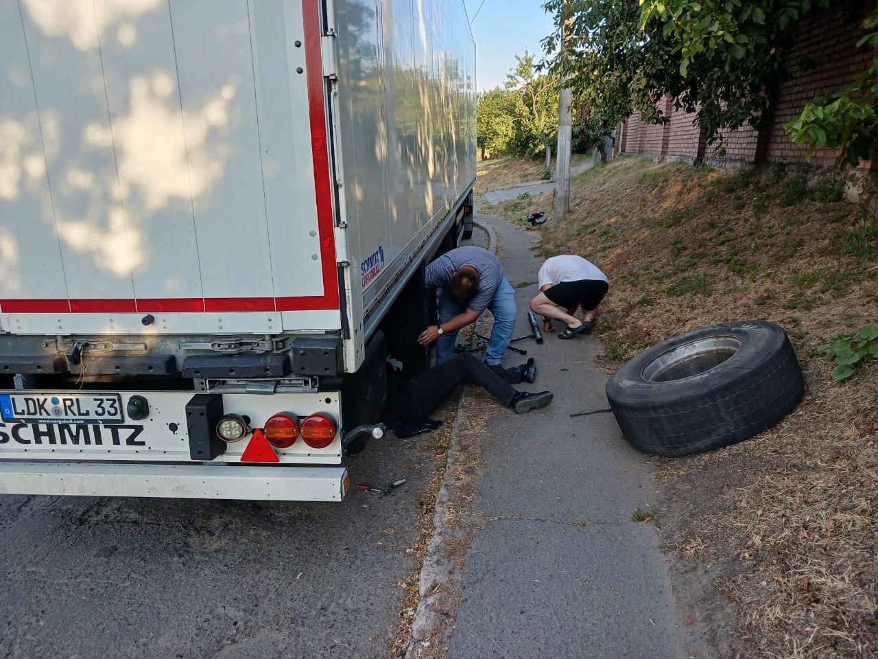 Mussten dann aber feststellen, dass ein Reifen am Auflieger platt war.